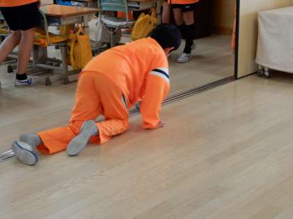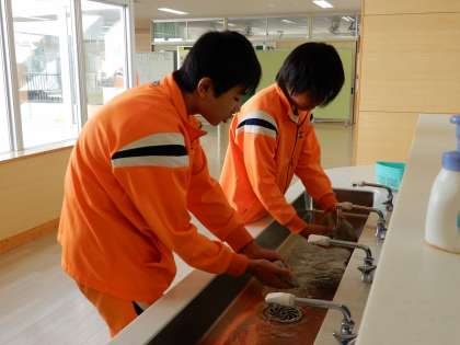 新しい校舎に感謝の気持ちで清掃しています。黒潮ホールでは、事務の方々の研修会で使用しています。多くの方々が本校に来校します。