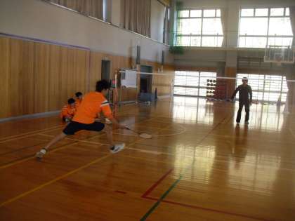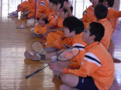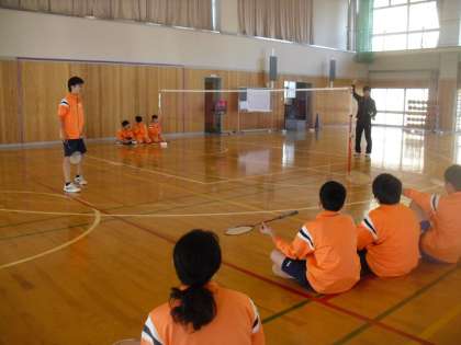 8年生は体育でバドミントンを行っています。生徒代表と教員のプレイを見て、自分のフォームなどを振り返りました。