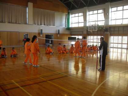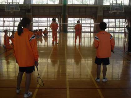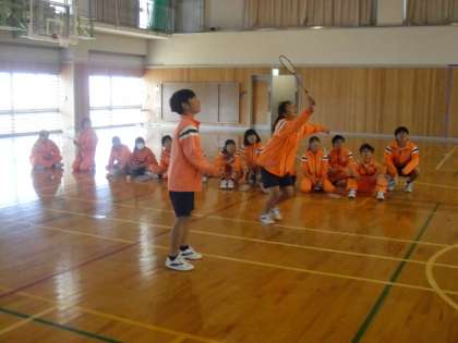 「バトミントン」を学習しています。両サイドに分かれて勝負し、勝ったペア−がそのまま残ることができます。一本勝負なのでみんな必死です。