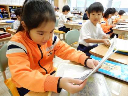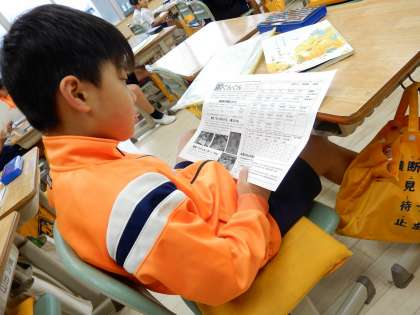 担任の先生からのおたよりを真剣に読んでいます。黒板には毎日、子どもたちにメッセージです。風邪が流行ってきました。週末の過ごし方も注意してください。