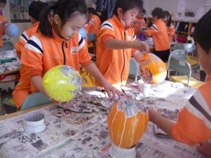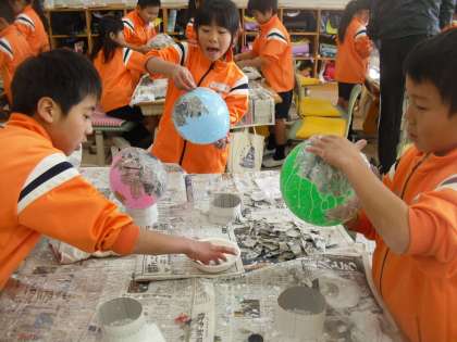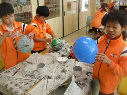 2年生は図工で「風船はりこで動物をつくろう!」という活動を行っています。風船を膨らました後に新聞紙を貼り付けています。