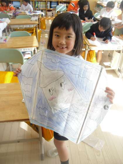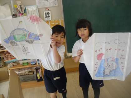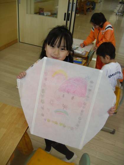 1年生は凧作りを行っていました。凧が完成した子を撮影しました。