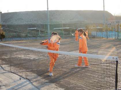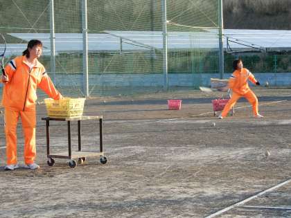 ソフトテニス部です。6人とメンバーは少ないですが、課題をもって練習しています。体育館ではバスケットボール部、音楽室で吹奏楽部も、寒いですが頑張って練習しています。