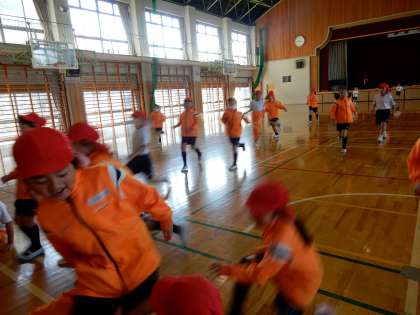 タグを付け、ルールを決めて仲間と励まし合いながら楽しく鬼ごっこです。江本先生が約束事を説明しています。