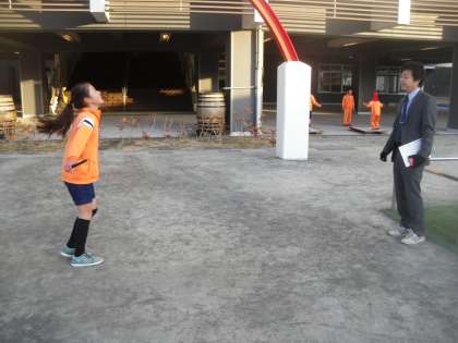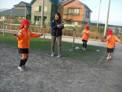 今朝のなわとび運動の様子です。教員が進捗状況を確認しながら、子どもの活動を見守っています。