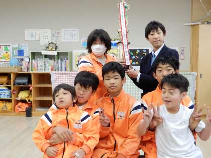 それぞれの課題に取り組んでいます。合同運動会のトロフィーが持ち回りで届きましたので、みんなで写真を撮りました。運動会みんな頑張りました。