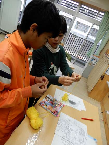 製品づくりをする目的の明確化、発達特性やつけたい力を明確にした作業内容の設定の二点を意識して授業しています。生徒たちは、「どうしたら上手に編めるのかな」と集中して取り組んでいます。みんな上手に「アクリルたわし」制作を頑張っています。作品は販売する予定です。よろしくお願いします。