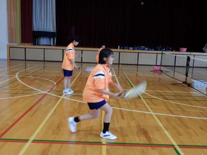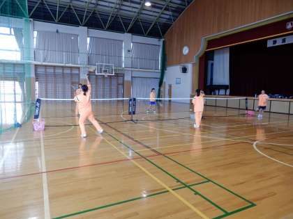 ○女子ソフトテニス部です。グラウンドが雨の影響があり、体育館で練習しています。