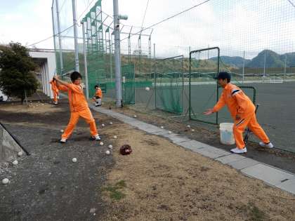 ○野球部です。グラウンドが柔らかいので、素振り、ティーバッティングの練習です。毎日50本でいいので、家庭でも素振りを毎日続けましょう。
