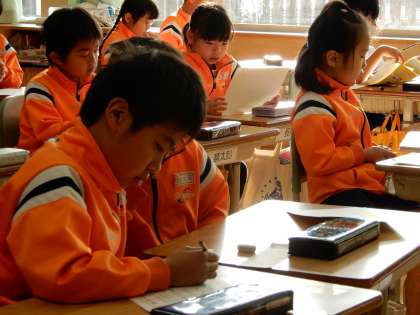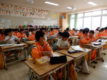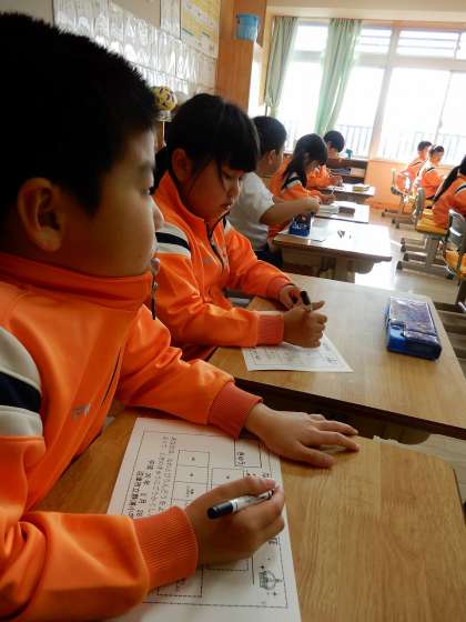 漢字テストのあとに健康カードを記入しています。隆宏先生の話をしっかり聞いて記入しています。