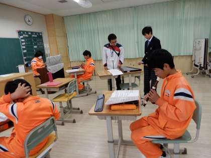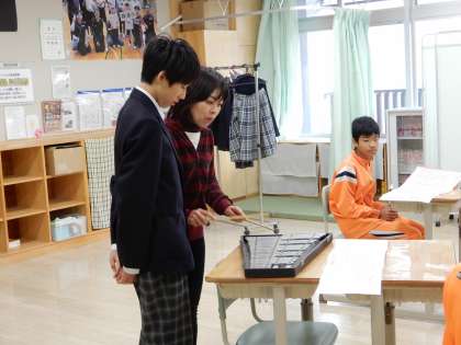 ○4時間目は、C組D組の合同学活で、「涙そうそう」の合奏練習です。頑張っていますね。