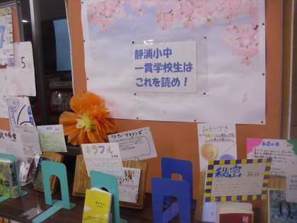 2階学校図書館前には、9年生の本紹介コーナー「静浦小中一貫学校生はこれを読め!」があります。9年生一人ひとりがお気に入りの本を紹介しています。