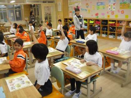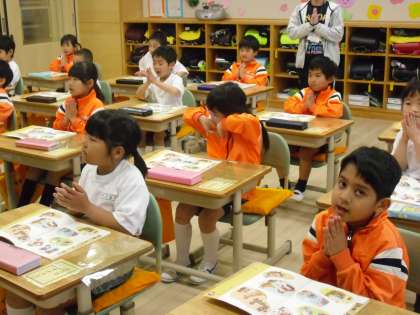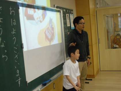 1年生は国語で「あいさつしよう」という教材を学習していました。「おはようございます。」「ありがとうございます。」など、時と場に応じたあいさつを学びました。