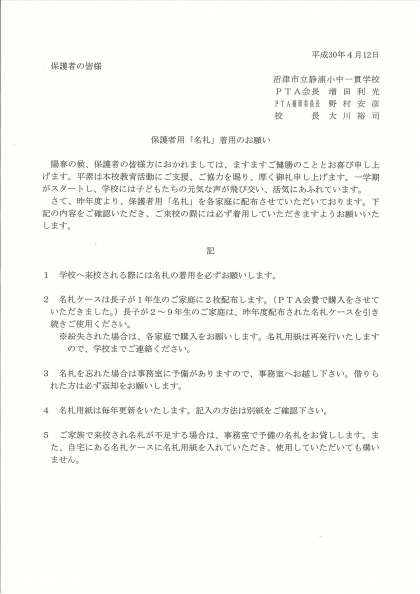 本日、「保護者用名札着用のお願い」という文書を長子に配布しました。
