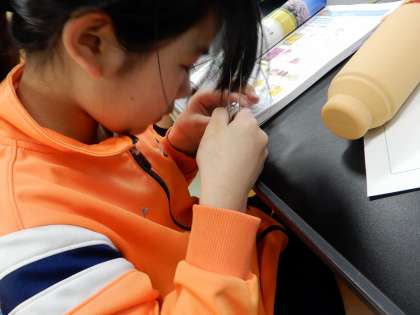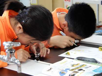 タンポポについて学習です。実際にルーペで集合花のタンポポを調べています。
