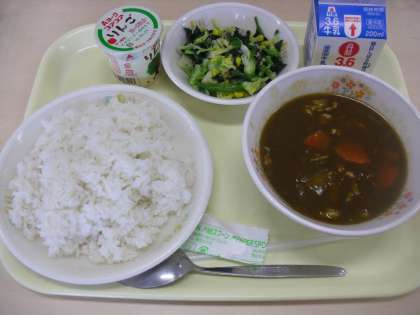 今日の給食の献立 カレーライス 牛乳 コーンと野菜の炒め物 りんごヨーグルト
