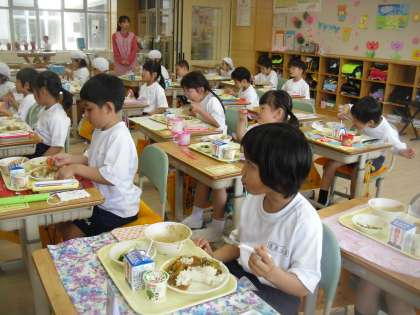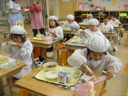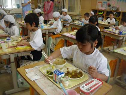 「おいしい給食をいただきます!」と、全員で唱和した後に、給食を食べました。今日はカレーライスでした。