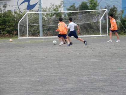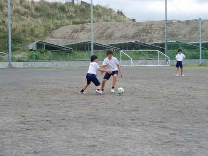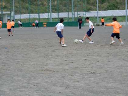 サッカー部です。屋内では吹奏楽部、卓球部、女子バスケットボール部が朝練習頑張っています。