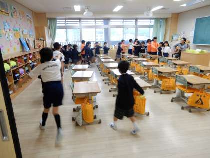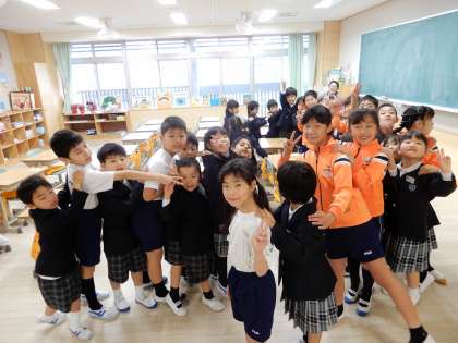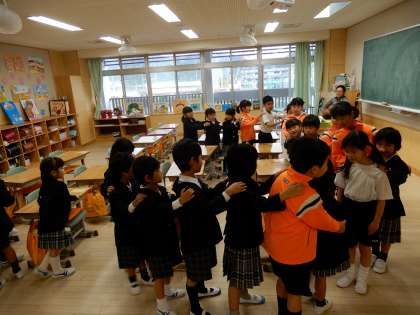 匡崇先生のギターに合わせて室内を自由に歩き回って、じゃんけんポン。楽しそうですね。4年生の皆さんありがとうございました。