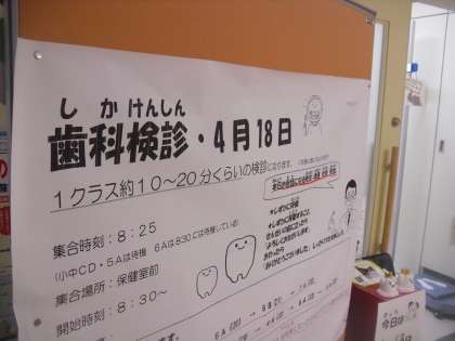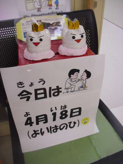 今日は「よいは(418)の日」です。偶然にも歯科検診が行われていました。保健室入り口には養護教諭が用意した可愛らしいマスコットが子どもたちをお出迎えです。