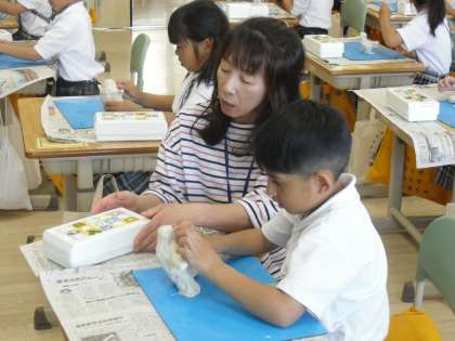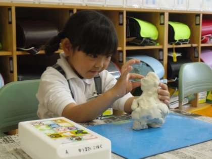 粘土工作をしています。学習問題「かたまりから引き出して作ろう」にそれぞれ工夫して取り組んでいます。