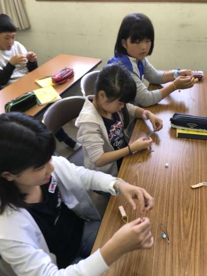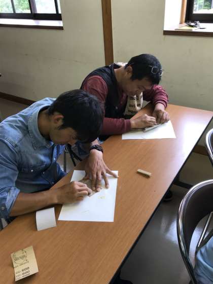 1〜8班はストラップ作りのクラフト活動に入りました。お気に入りの木片や紙やすりを磨いて仕上げます。宮原先生の職人魂に火がついたようです。