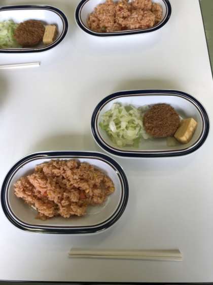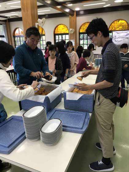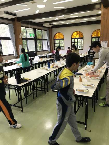クラフト&プラネタリウムが終わり、食事係が昼食の準備は入りました。メニューはチキンライスとメンチカツです。校長先生も一緒に準備してくださっています。