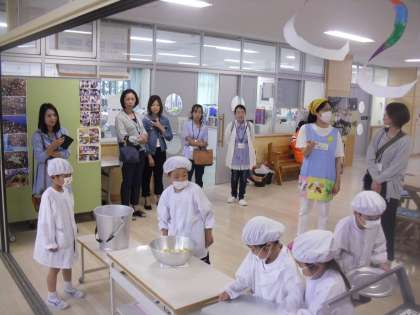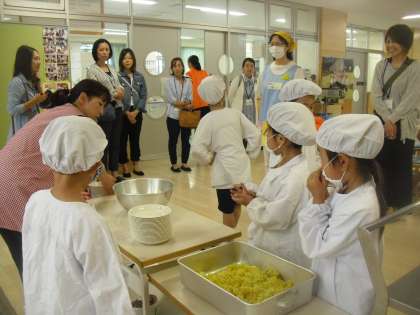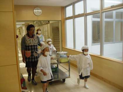 本日、「1年保護者給食試食会」を開催しました。最初に子どもたちの配膳の様子を参観していただきました。