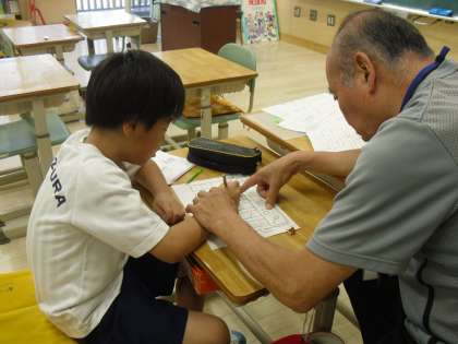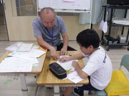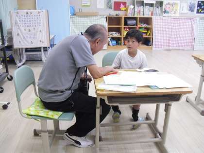 絵を見ながら、その名前を書いています。一対一で気軽に質問ができ、楽しそうです。