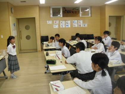 6年生は言語科「英語の時間」において、英語で自己紹介をしました。児童が自己紹介をした後に、ALTから自己紹介の内容にあう質問を全体の場で行いました。