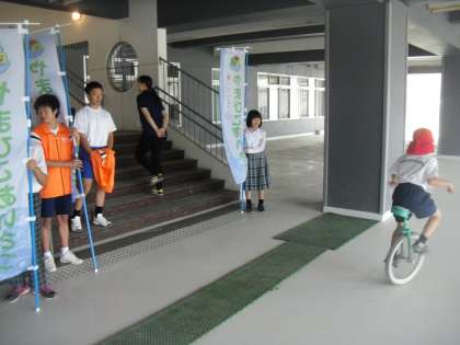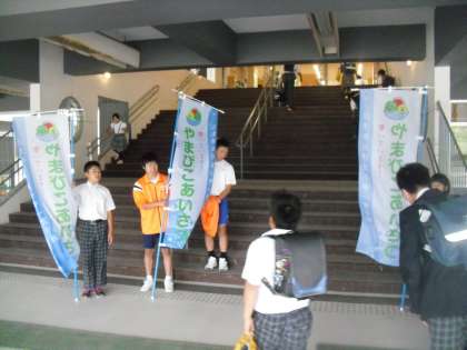 自治会執行部と福祉委員が1階ピロティ階段付近に立ち、「やまびこあいさつ運動」を行いました。児童生徒がいつでも自然に気持ちのこもったあいさつができるよう、執行部と福祉委員の子たちが大きな声であいさつをしていました。