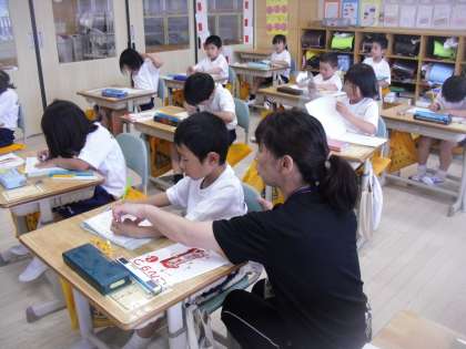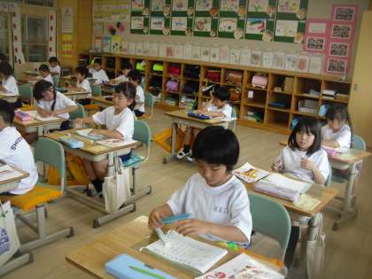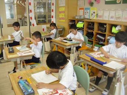 1年生は算数で足し算の学習をしました。足し算の理解を深めるためにおはじきやブロックを使って行っていました。