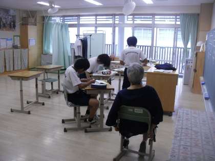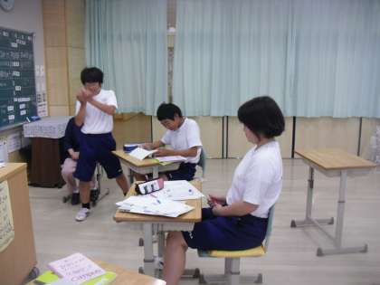 中C組の授業の様子です。数学では面積の求め方について、ミニ先生が友達に教えています。