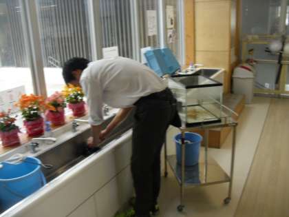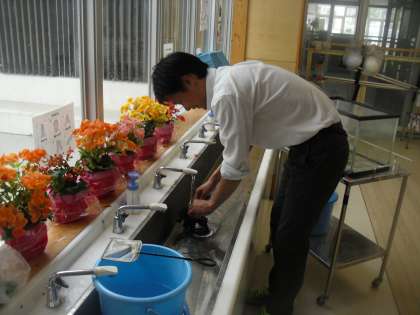 河村先生が職員室前の水槽をきれいにしてくれています。ありがとうございます。