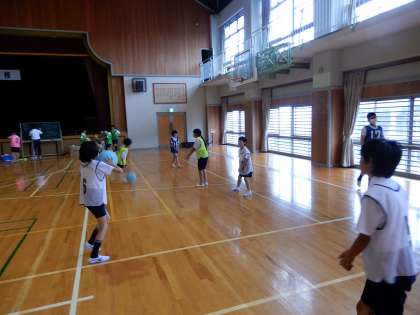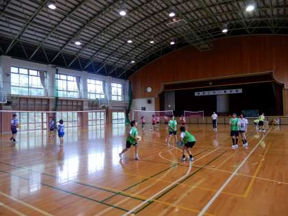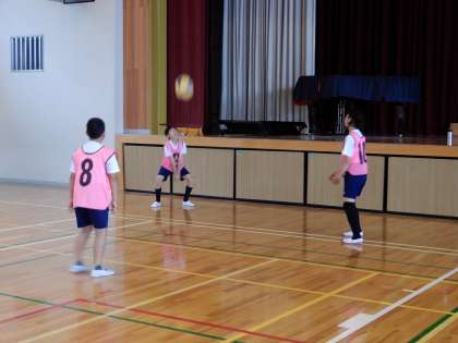 ソフトバレーボール、パスをつなぐにはどんな動きが必要か、考えながら練習しています。