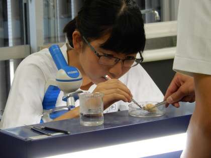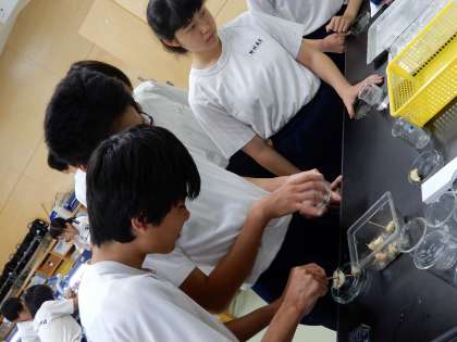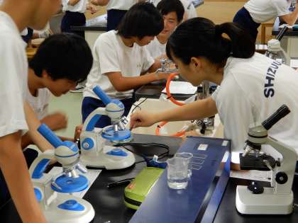 顕微鏡を使用して細胞の観察をします。にんにくのにおいが…。