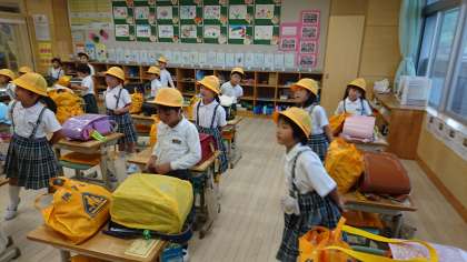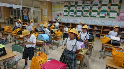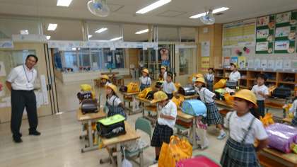 1年生の帰りの会の様子です。加藤先生が出張で不在のため、中野先生と小口先生が担当し、帰りの会を行いました。小口先生と「太陽のサンバ」を歌ったり、中野先生が「ばばばあちゃんシリーズ」の読み聞かせを行ったりしました。