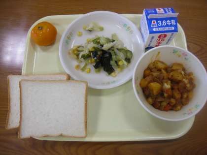 今日の給食の献立 食パン 牛乳 ポテトミートグラタン わかめサラダ 寿太郎冷凍みかん