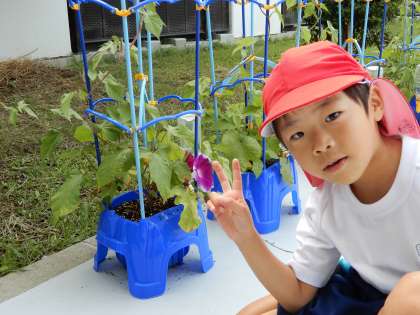 1年生が一生懸命育てている朝顔がきれいに咲いてきました。挨拶運動ありがとうございます。