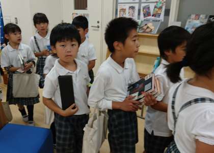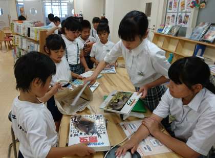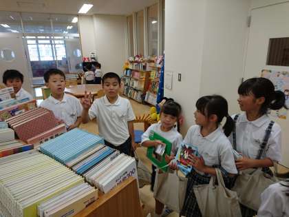 学校図書館での貸し出しの様子です。みんなたくさんの本を借りています。