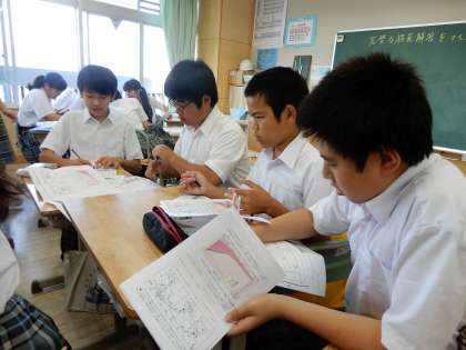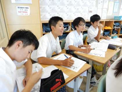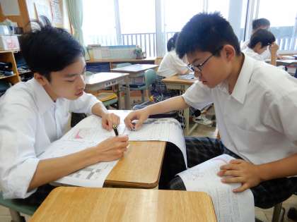 テスト返しと解説です。社会も自分たちで振り返りをしながら、模範解答を考えています。