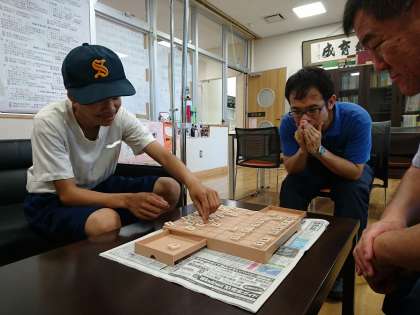 中D組の生徒が校長先生と将棋の対決です。傍らで住友先生が勝負の行方を見守っています。