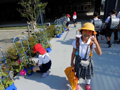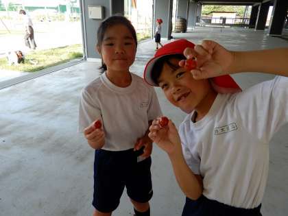 子どもたちが育てている夏野菜に実がなってきました。1年生は朝顔が咲き始めました。今日も暑くなりそうです。