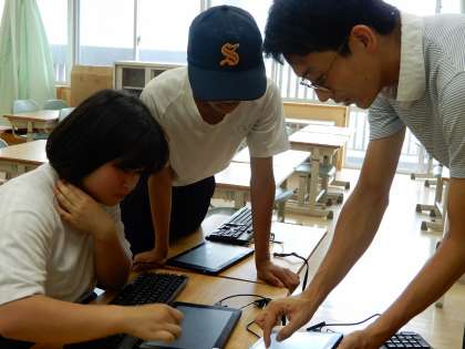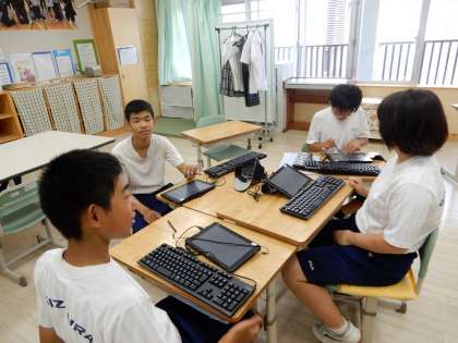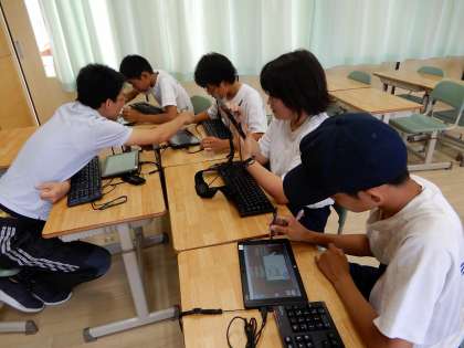 情報教育の授業で、タブレットを使用してプログラミングをしています。様々な機能への気づきが早く楽しく学習しています。