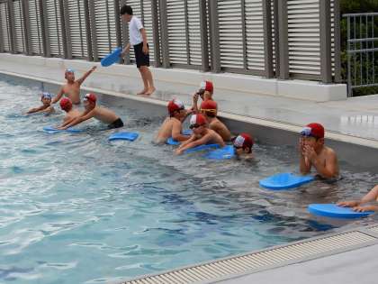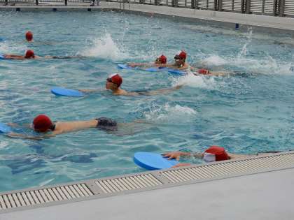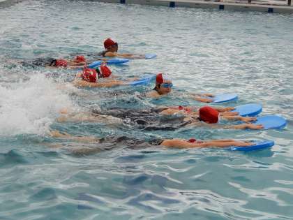 水泳の授業です。ビート版を使用して泳ぐ練習です。