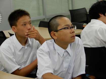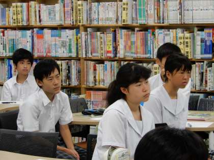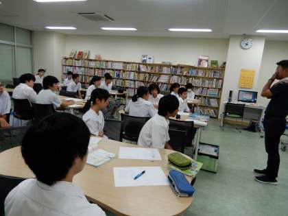 図書館で授業ですが、みんな集中して崇範先生の話を聞いています。