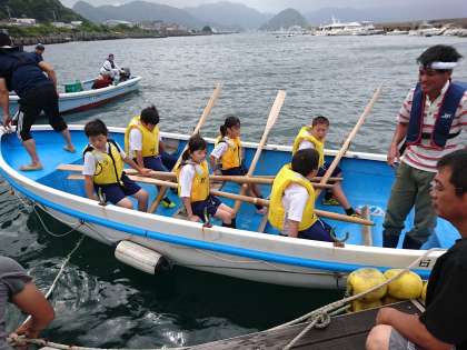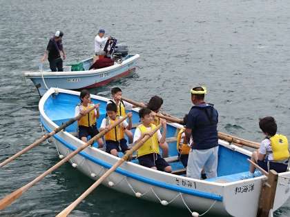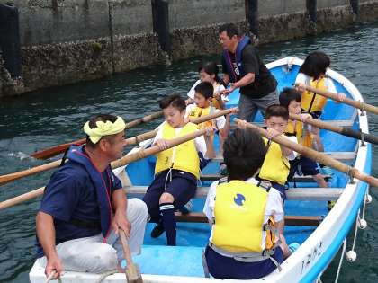 静浦漁業協同組合青壮年部の指導のもと、5年生がカッターボート体験を行いました。みんなで声を掛け合いながら、カッターボートを動かしています。