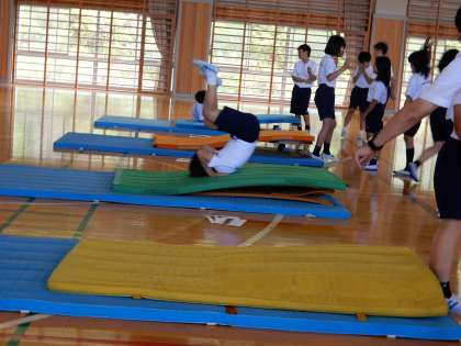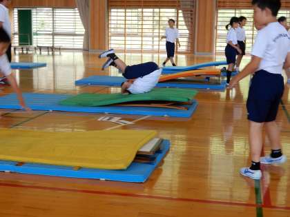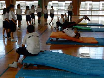 「マット運動」滑らかに後転や開脚後転をする練習をしています。マットの傾斜を段階的に変えています。