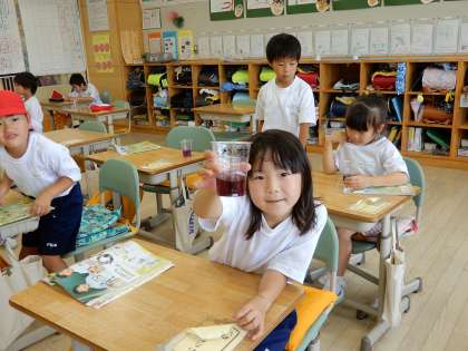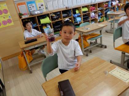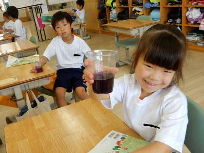 あさがおの観察です。あさがおのつぼんだ花びらから色を取り出しました。みんなきれいな色です。