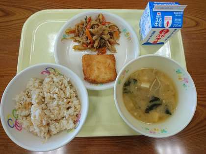 今日の給食の献立 とり飯 牛乳 太刀魚フライ 五目きんぴら えのきと豆腐のみそ汁